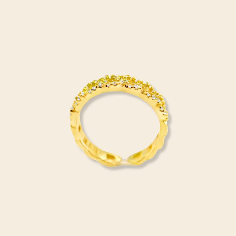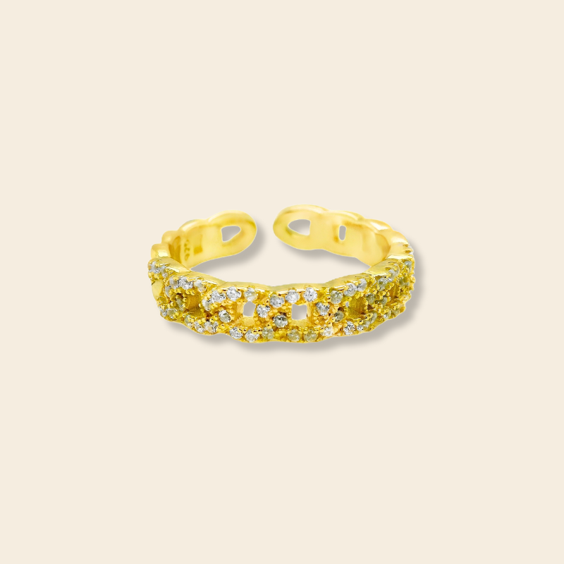 Anillo ajustable elaborado en plata 925 y en plata 925 bañada en oro 18k, engastado con circones que reflejan la luz en cada movimiento. Su diseño minimalista y elegante lo convierte en un accesorio atemporal, ideal para usar solo o acompañado de otras joyas.