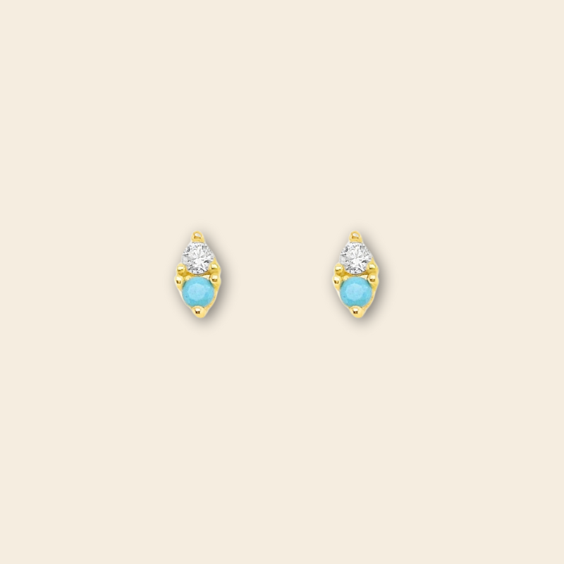 Delicadeza y sofisticación en cada detalle. Estos aretes tipo stud, elaborados en plata 925 con baño de oro 18k, combinan una piedra turquesa central con pequeños circones que aportan brillo y elegancia. Ideales para un look diario con un toque de color o para complementar un outfit especial con estilo y distinción.