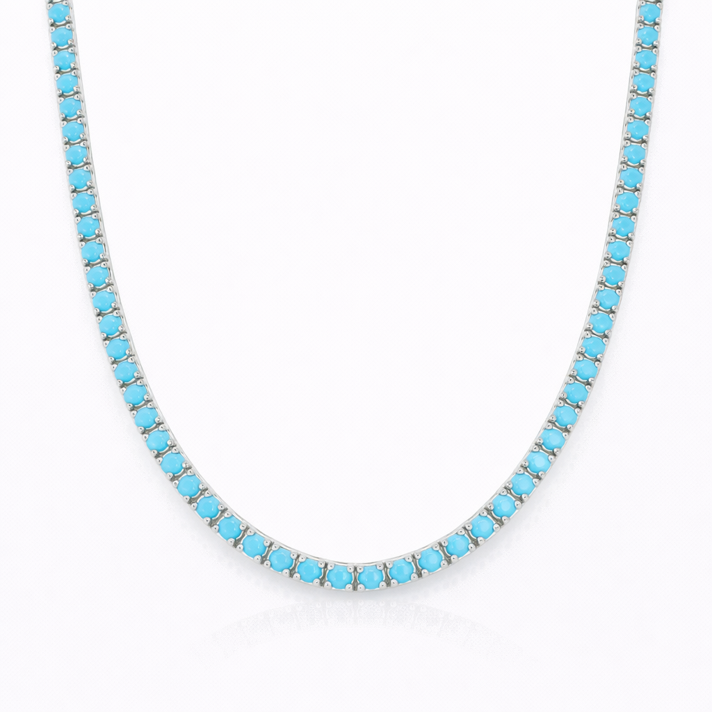 El collar Azure Halo captura la belleza luminosa de los tonos turquesa en una pieza delicada y llena de vida. Sus zircones en color azul turquesa reflejan la luz con destellos vibrantes que evocan aguas cristalinas iluminadas por el sol, mientras la base dorada aporta un contraste cálido y sofisticado.