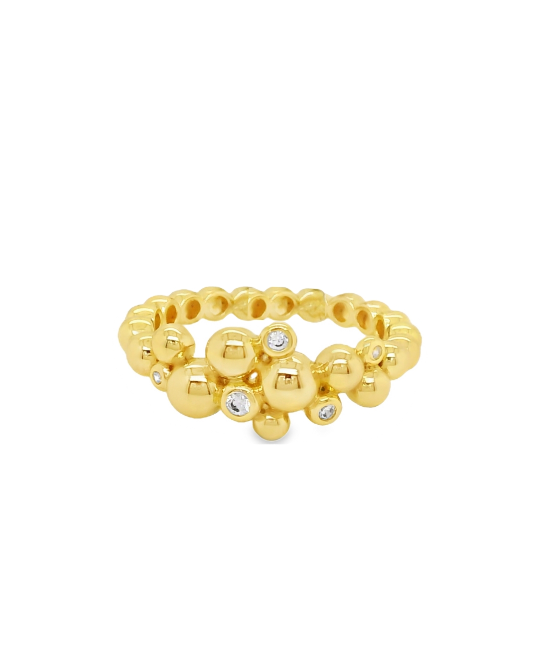 Anillo elaborado en plata 925, con un delicado diseño de esferas en distintos tamaños que crean un ritmo visual único. Algunas de ellas incorporan circones brillantes, aportando destellos sutiles que contrastan con la suavidad del metal. Una pieza sofisticada y atemporal, ideal para elevar cualquier look con un toque de luz.
