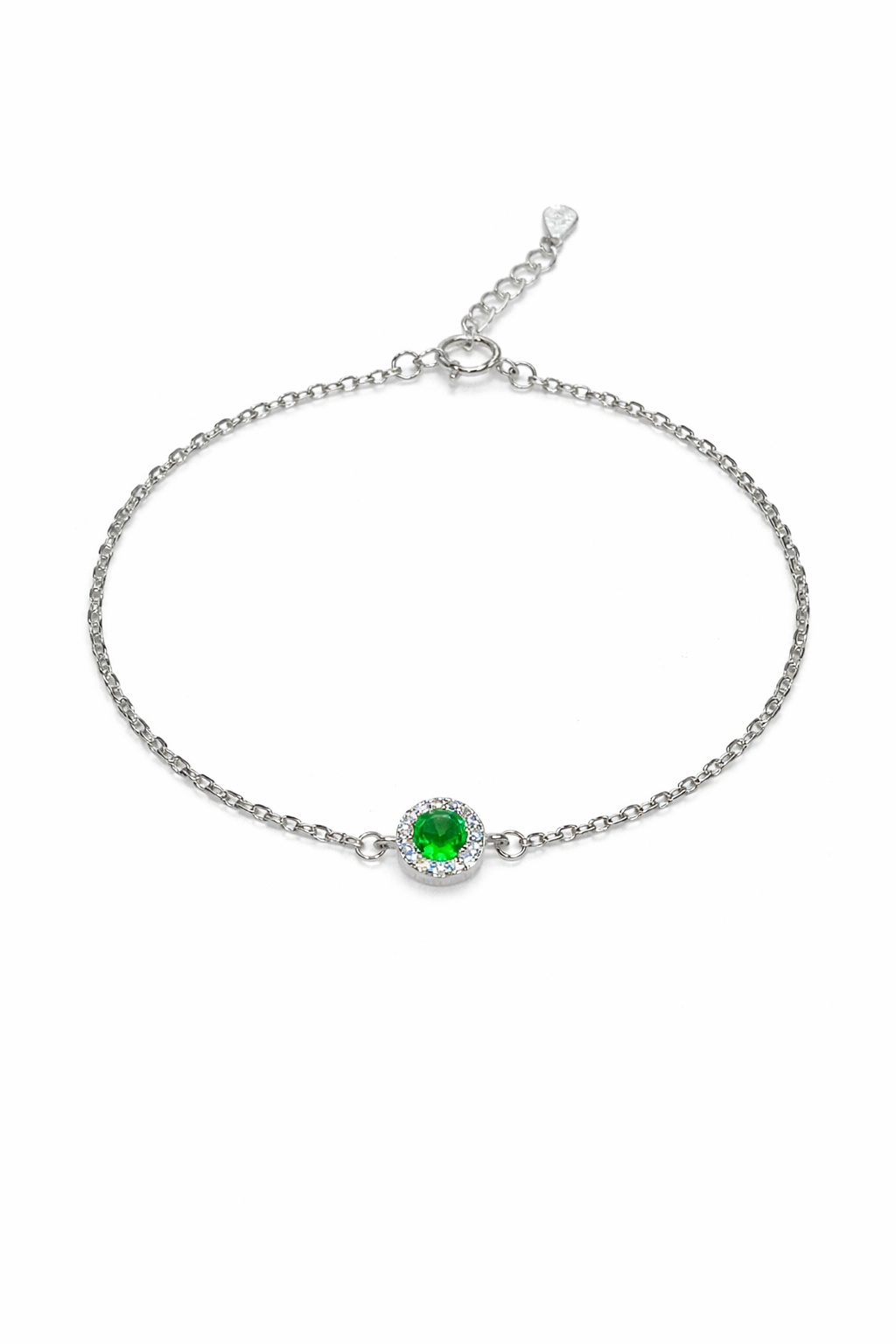 Brazalete de plata italiana 925 tipo cadena, diseñado para resaltar la delicadeza y el estilo sutil. Su estructura fina y ligera se complementa con un delicado circón verde en el centro, que aporta un toque de color suave y un brillo femenino.