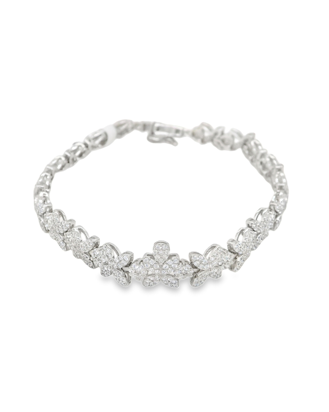 Brazalete tipo tennis elaborado en plata 925, con un diseño inspirado en formas florales que capturan la luz de manera sutil y sofisticada. Su brillo continuo lo convierte en la pieza ideal para la noche, aportando elegancia y presencia sin exceso. Un diseño atemporal pensado para acompañar ocasiones especiales.