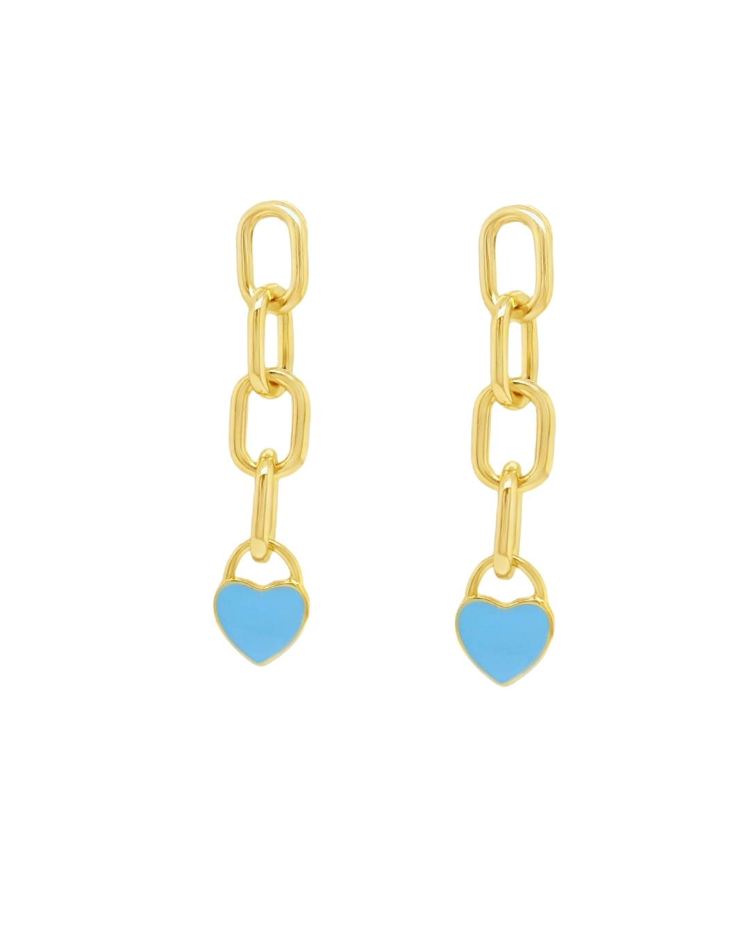 Aretes de eslabones en plata 925 con baño de oro, diseñados con un corazón colgante que añade movimiento y un acento romántico a la pieza. Disponibles con corazón en turquesa o corazón rojo, son ideales para dar un toque especial de color y personalidad a cualquier look, de día o de noche.