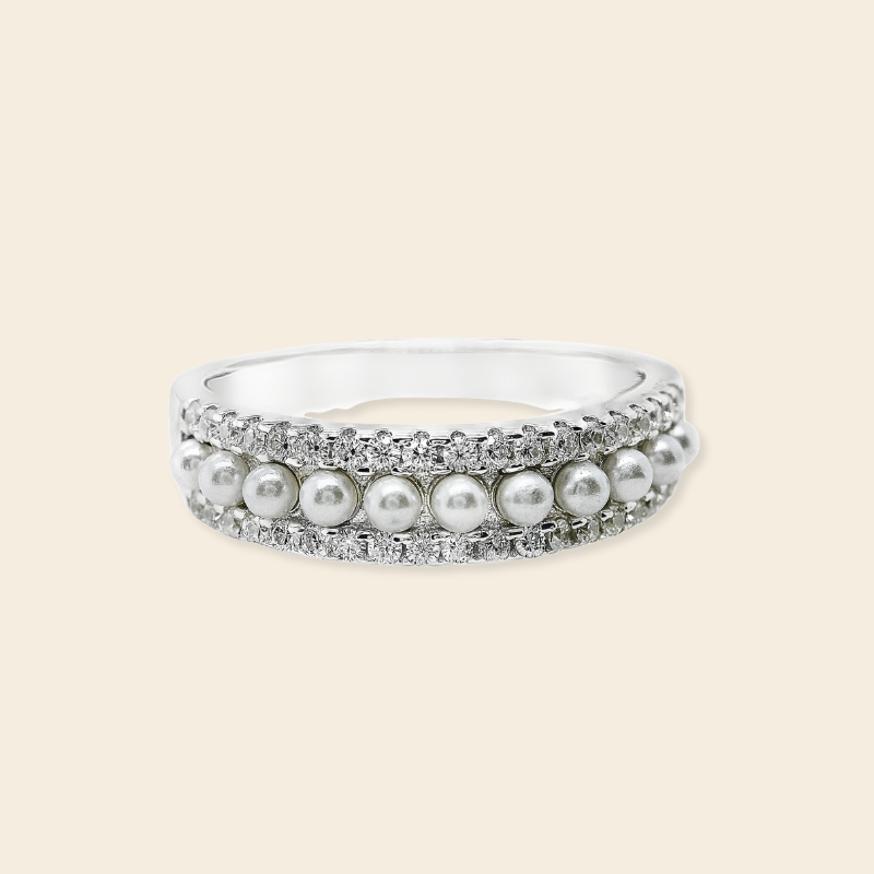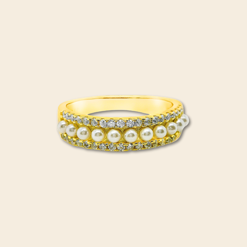 Anillo delicado y elegante que combina perlas alrededor de la banda con circones que aportan un brillo sutil y sofisticado. Disponible en plata 925 y en versión con baño de oro 18k, este anillo es perfecto para lucir solo o combinar con otros, añadiendo un toque de glamour y refinamiento a cualquier look.