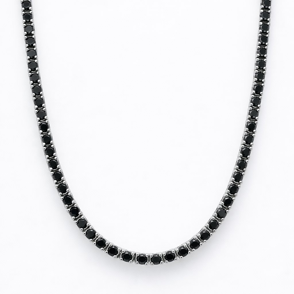 Enigmático y moderno, Midnight Veil envuelve el cuello con una línea de zircones negros que brillan con discreción hipnótica. La pureza de la plata italiana 925 equilibra la intensidad del color, creando una pieza elegante y contemporánea. Minimalista pero impactante, es perfecta para elevar cualquier look con un toque de sofisticación nocturna.