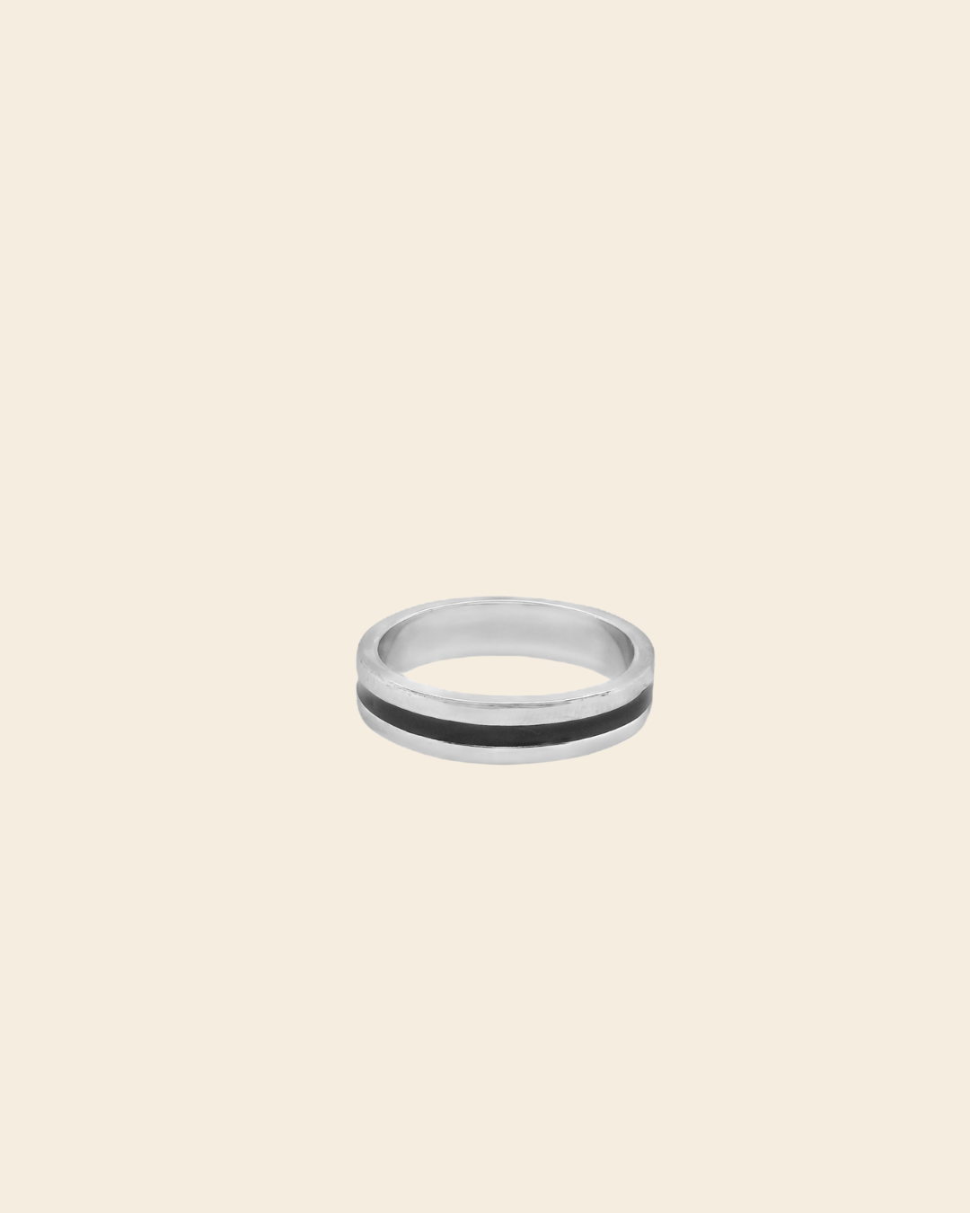 Anillo de plata con línea negra central. Un diseño moderno y minimalista que equilibra fuerza y estilo con un toque de contraste sutil.