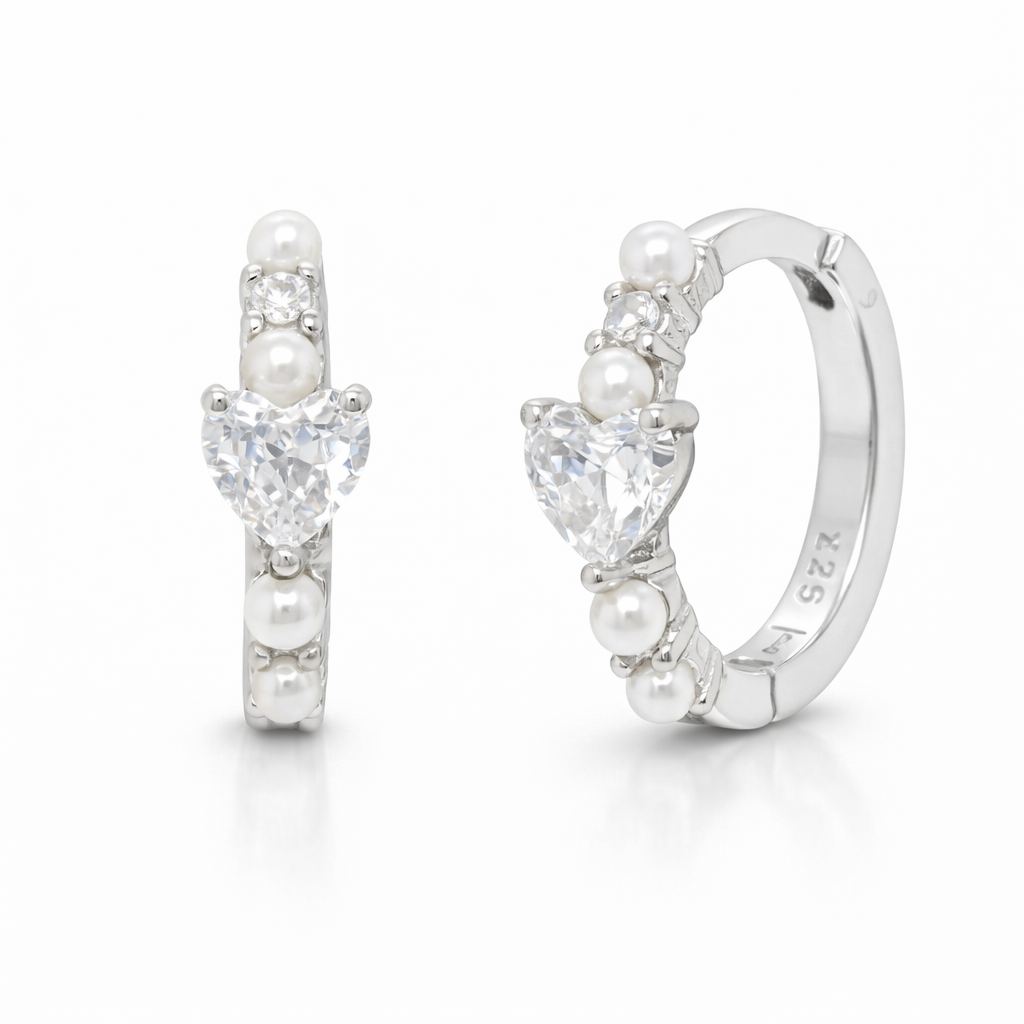 Radiantes y llenos de encanto, estos hoops destacan por un zircon en forma de corazón en el centro, rodeado de delicadas mini perlas cultivadas que aportan textura y suavidad. Elaborados en plata italiana de 925, capturan un brillo sutil con un toque romántico, perfectos para añadir luz y personalidad a cualquier look.