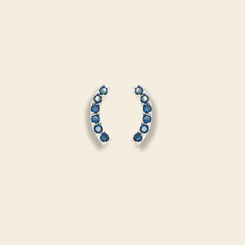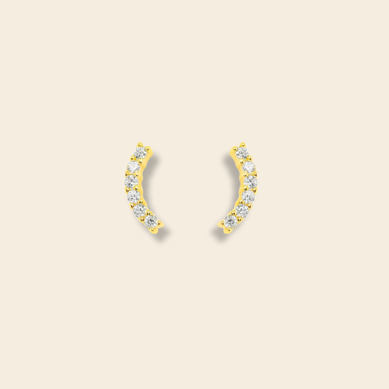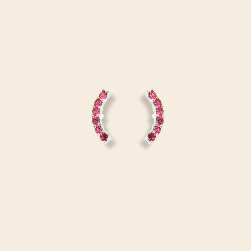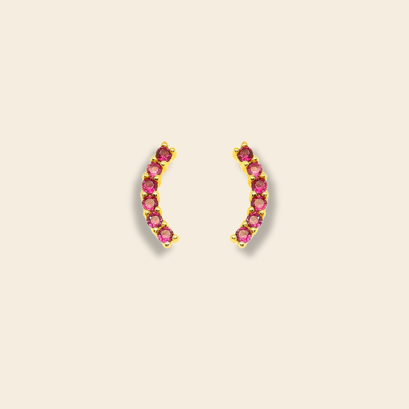 Aretes en forma de curva delicada, elaborados en plata italiana 925 con su version en Baño de oro. Cada pieza está engastada con circonias multicolor que reflejan la luz creando un efecto vibrante y moderno. Su diseño abraza la oreja con un estilo elegante pero divertido, perfectos para darle un toque único a cualquier look, ya sea de día o de noche.