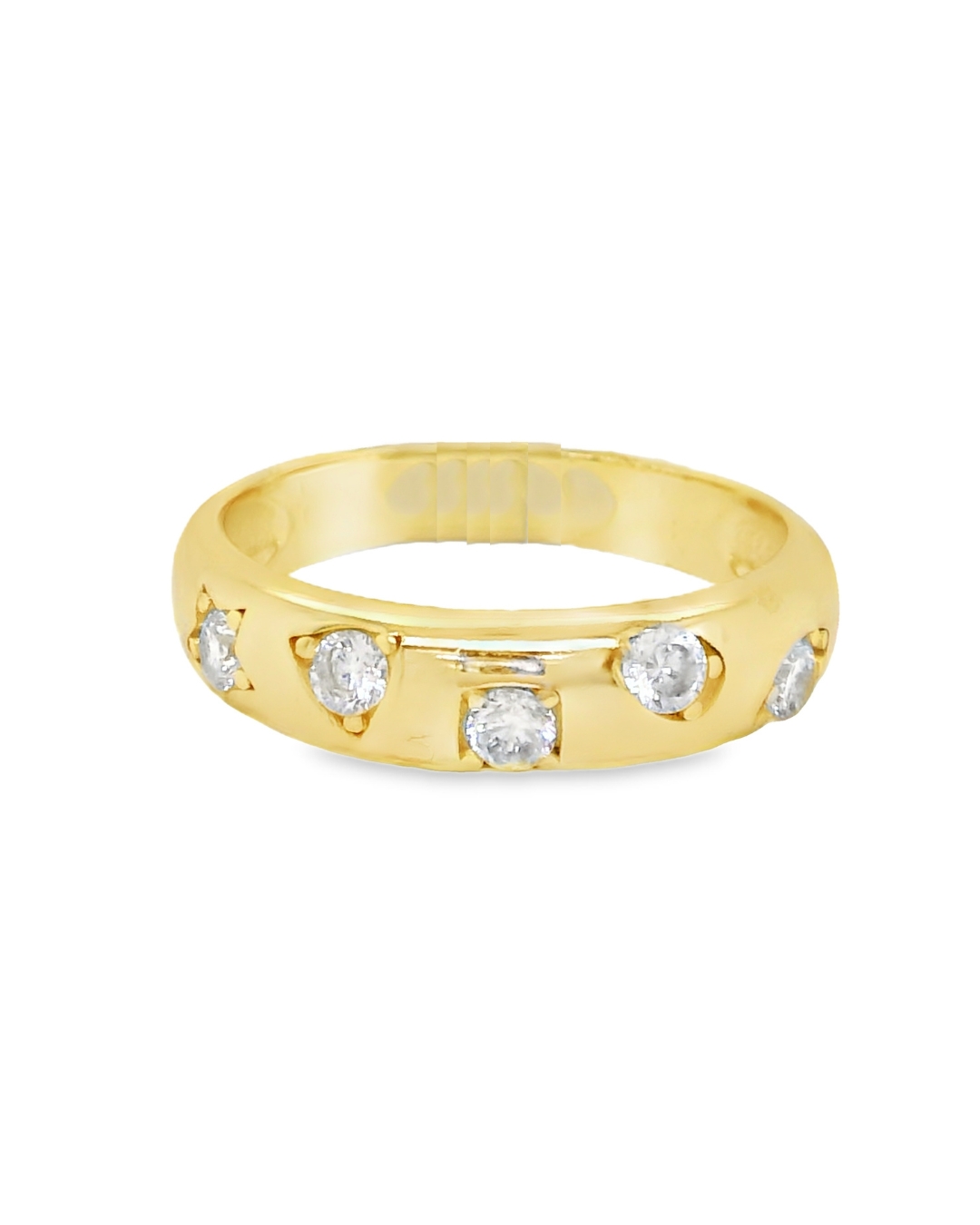 Anillo delicado en plata 925 con baño de oro, engastado con cinco circones que aportan un brillo sutil y elegante. Su diseño refinado lo hace ideal para el uso diario o para combinar con otras joyas, ofreciendo un toque de sofisticación discreta y atemporal.